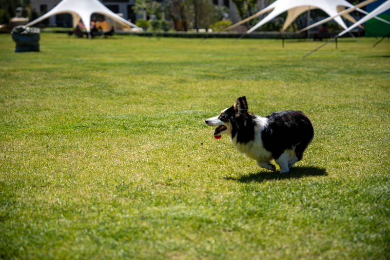 柯基奔跑在绿茵上