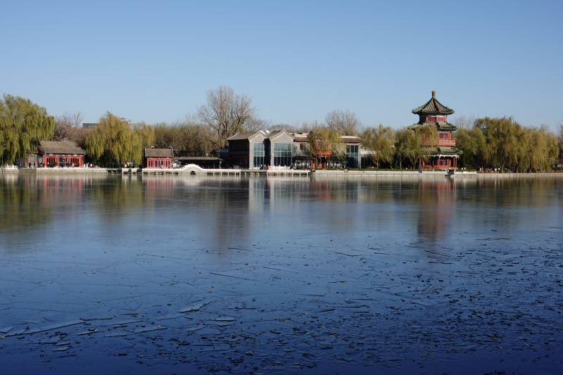 北京后海湖畔古亭映碧水