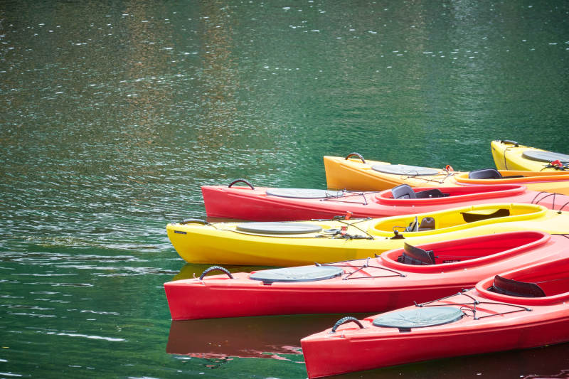 彩色皮划艇静泊湖面