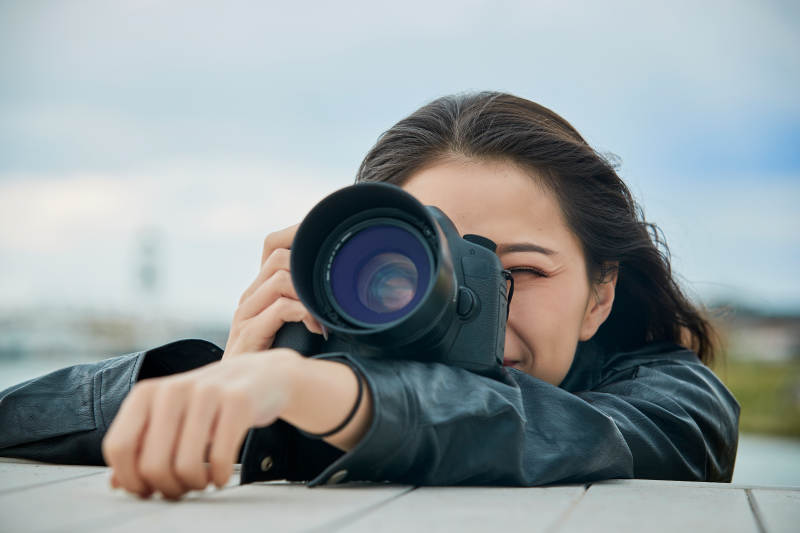 户外湖畔进行拍摄的亚洲青年女性摄影师