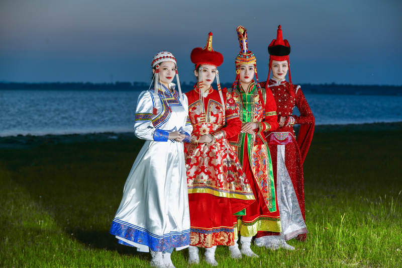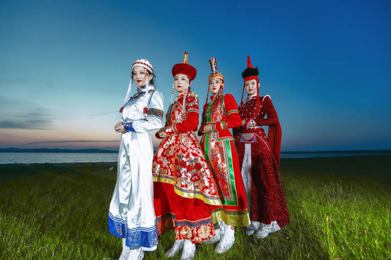 晚霞的草原湖畔穿蒙古族传统服饰的年轻女性
