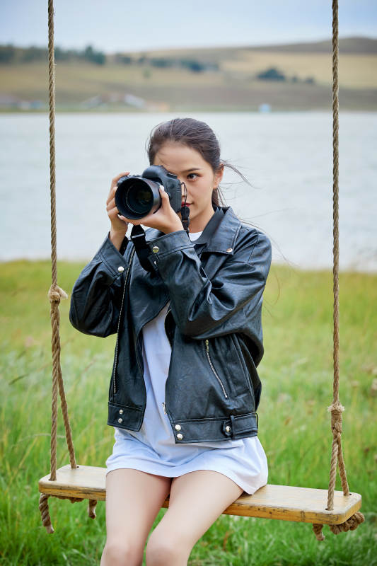 户外湖畔进行拍摄的亚洲青年女性摄影师