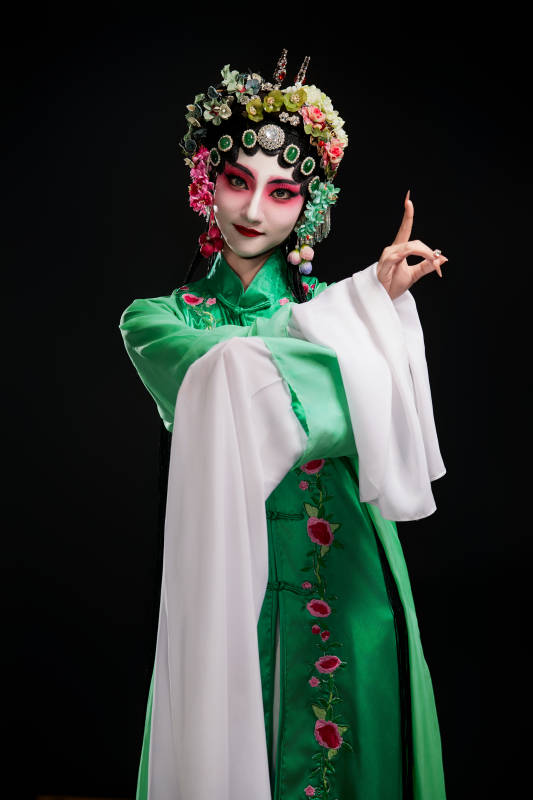 身着中国传统粤剧戏曲反串装扮的青年女性
