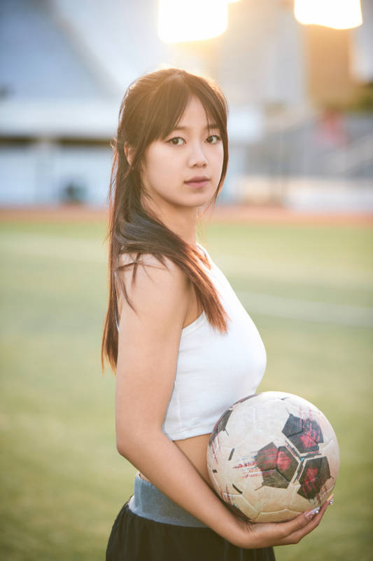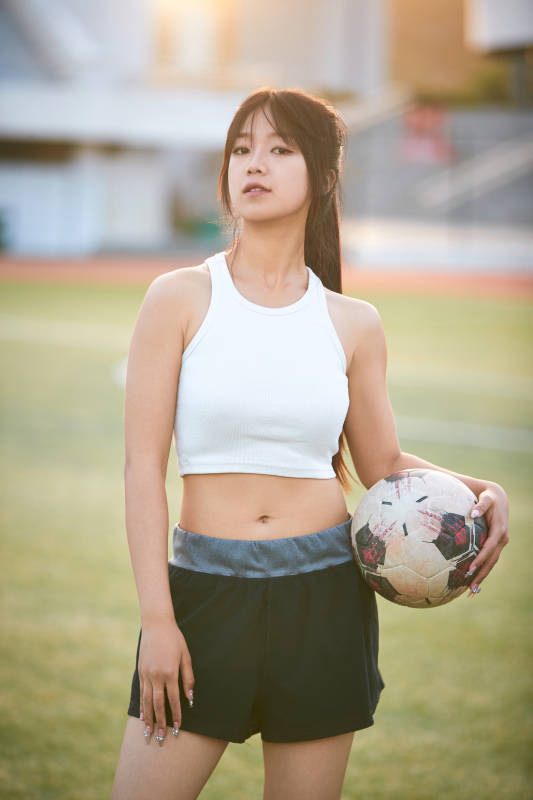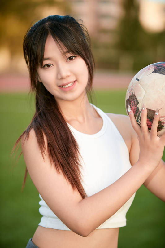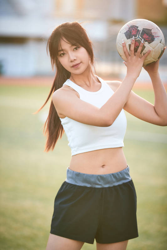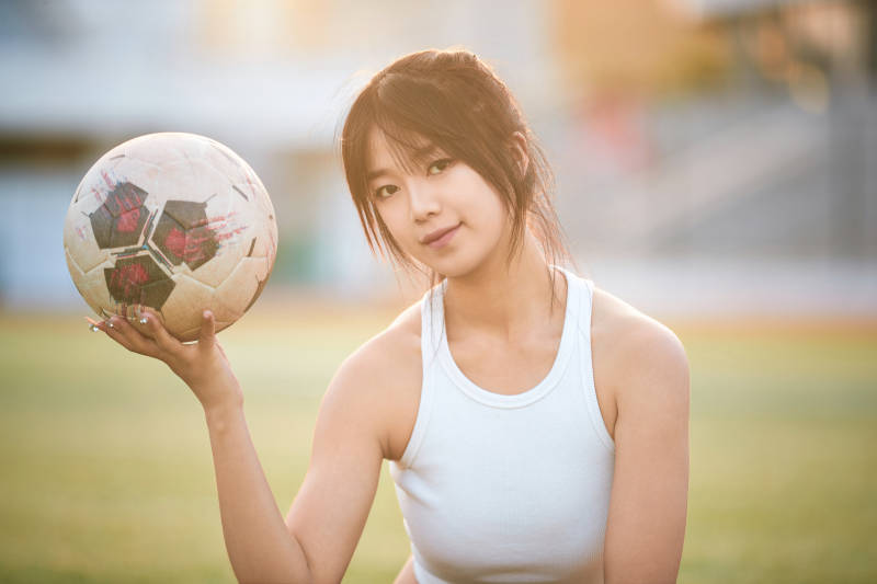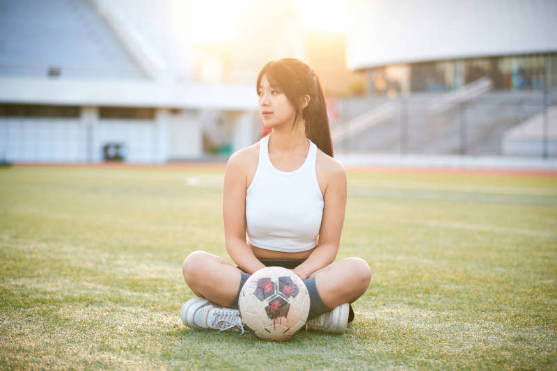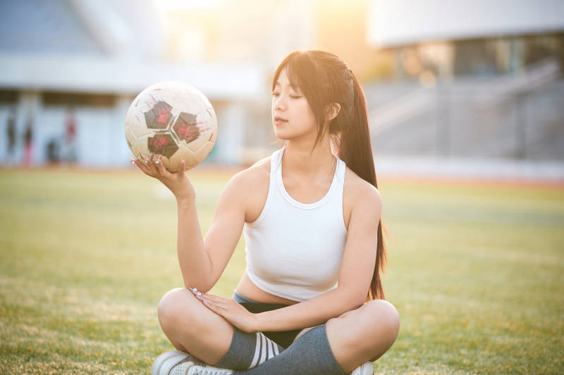 户外足球场上踢足球的运动员