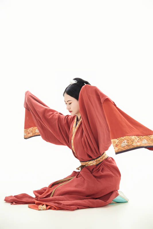 白色背景下穿着中国明朝明制汉服服饰的少女