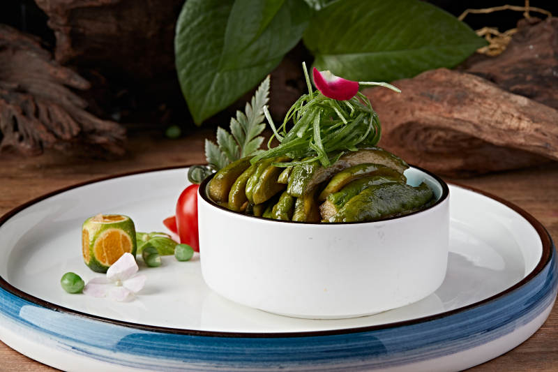 青花瓷盘装的清煮鸡丝配羊肚菌
