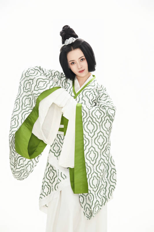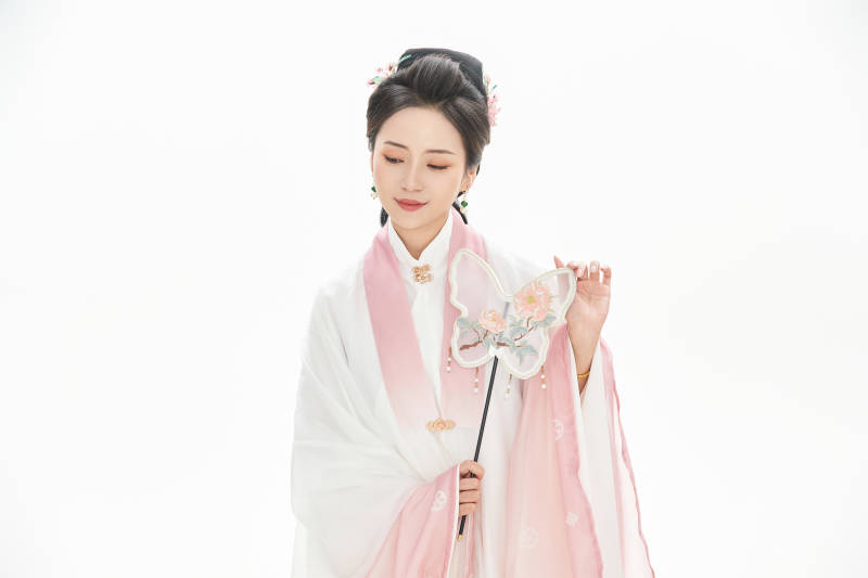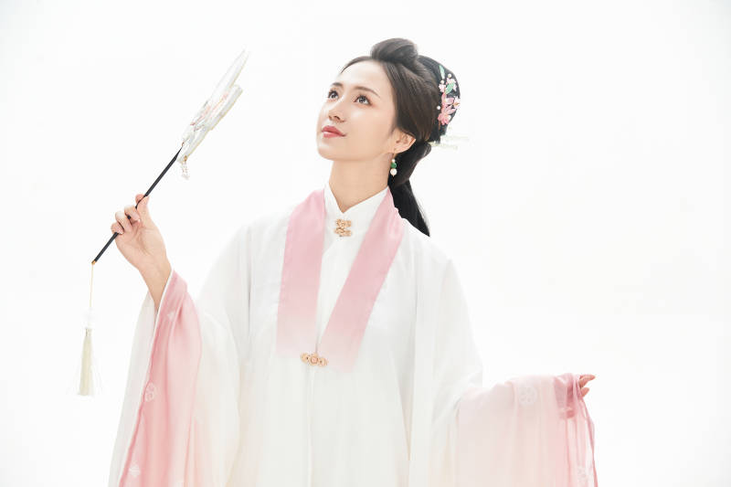 白色背景下穿着魏晋制汉服的少女