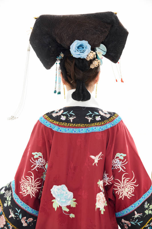 白色背景下穿着中国清朝宫廷服饰的少女