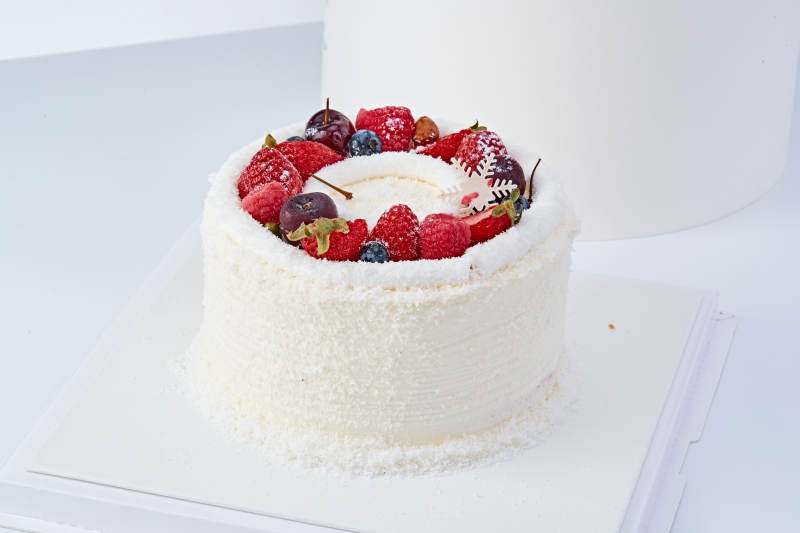 白色瓷盘装的水果戚风奶油拿破仑蛋糕