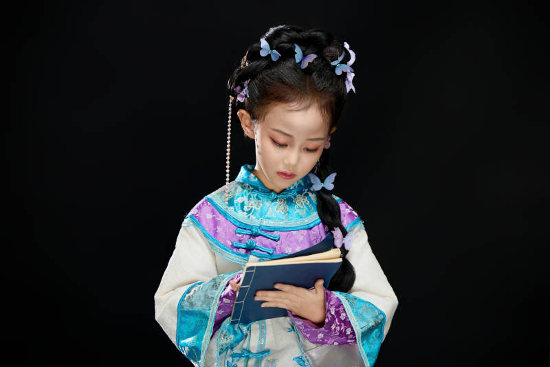 黑色背景下穿着中国明制汉服的中国女童