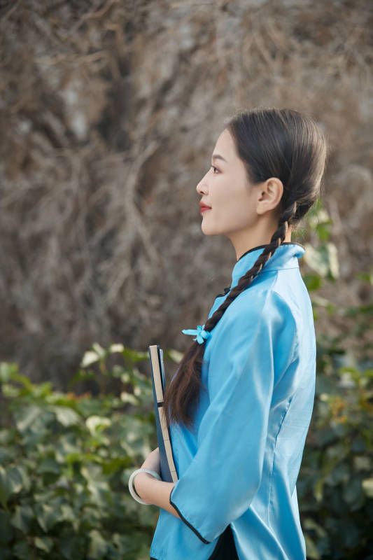 在古城身穿民国学生服饰的女大学生