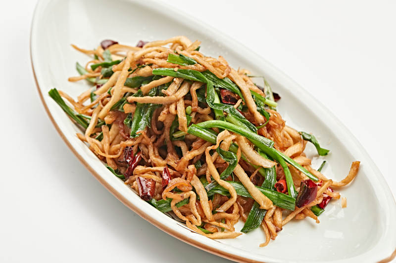 白色瓷盘装的韭菜辣炒杏鲍菇
