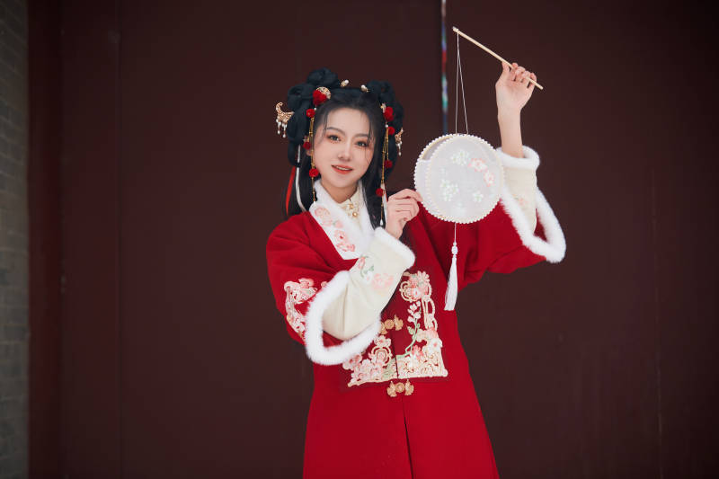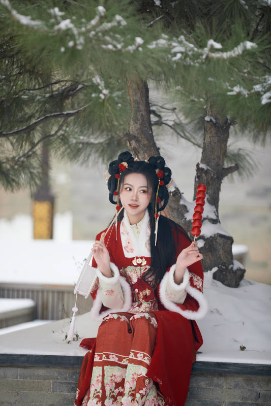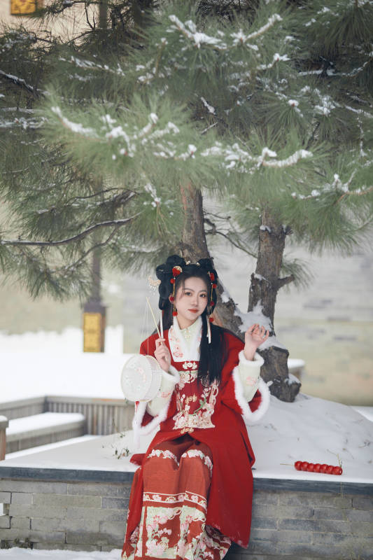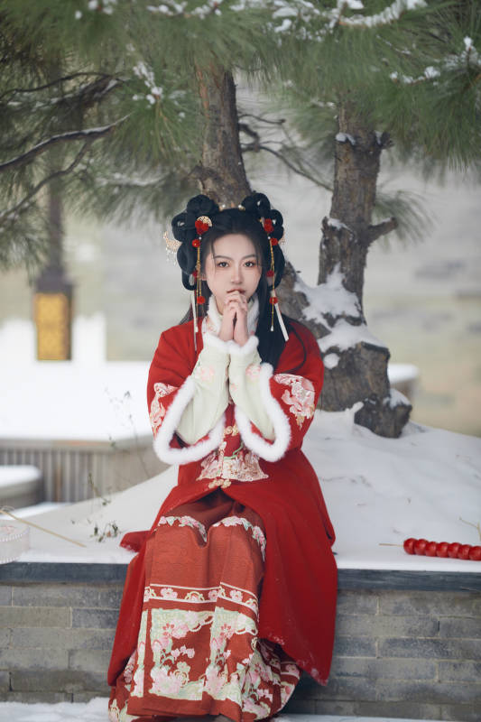 雪天户外身穿中式红色汉服的亚洲少女