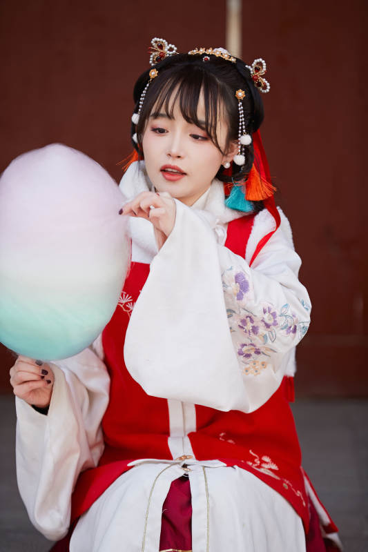 身穿喜庆汉服吃棉花糖的少女