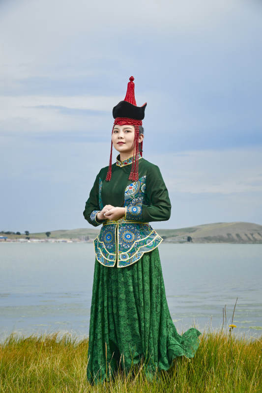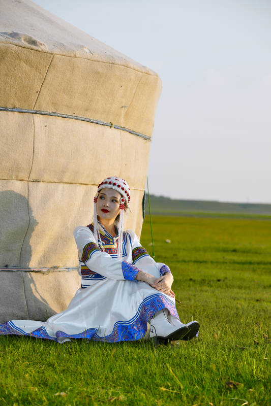 草原上穿着蒙古族传统服饰的亚洲年轻女性