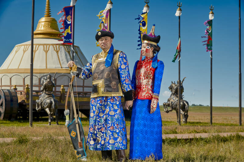 草原上蒙古包前穿蒙古族传统服饰的年轻夫妻