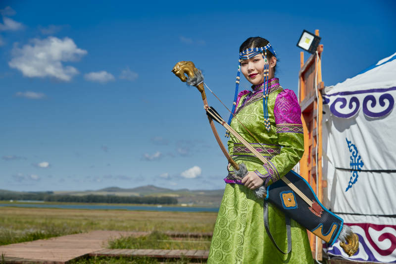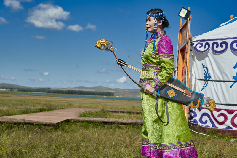 蒙古包前身穿蒙古族饰手持弓箭的蒙族少女