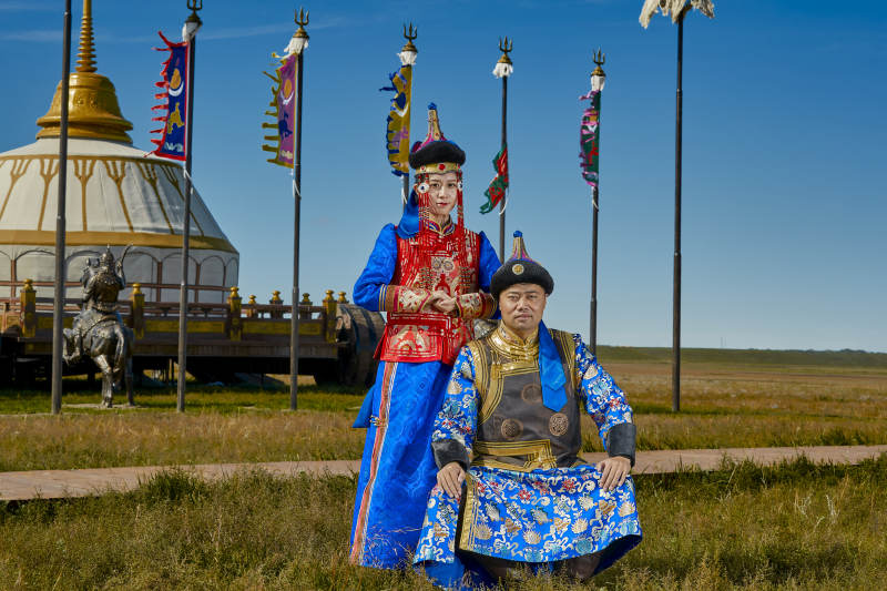 草原上蒙古包前穿蒙古族传统服饰的年轻夫妻
