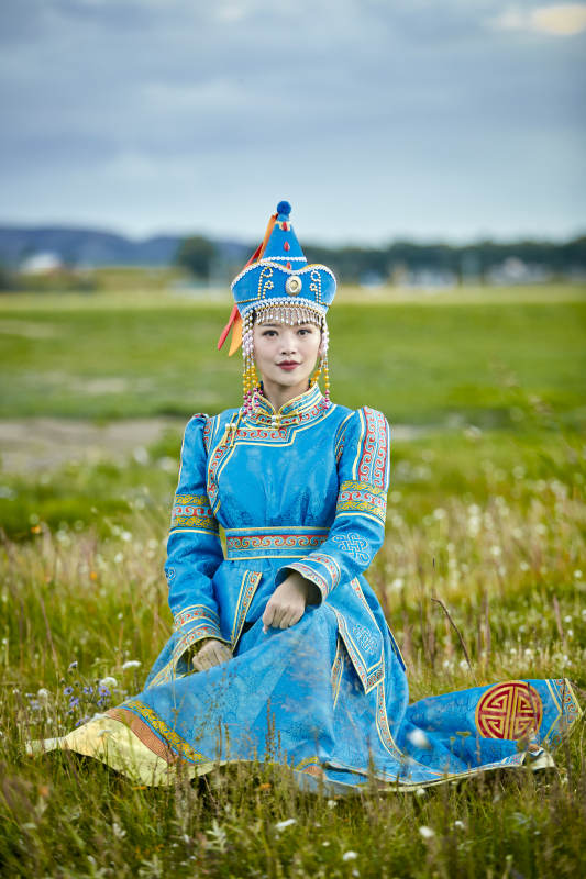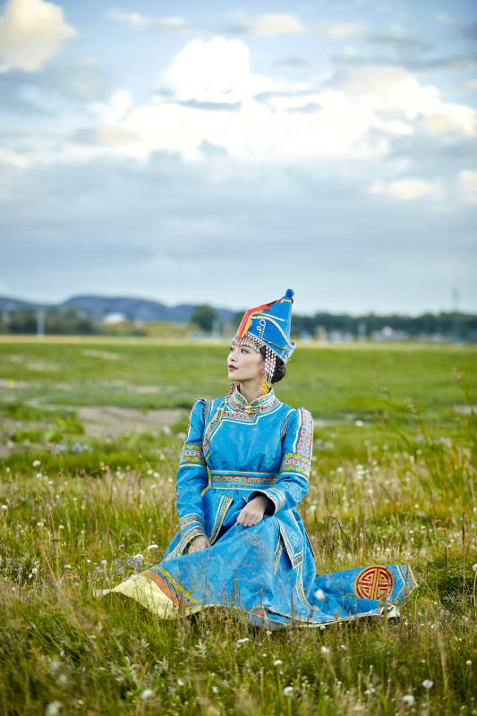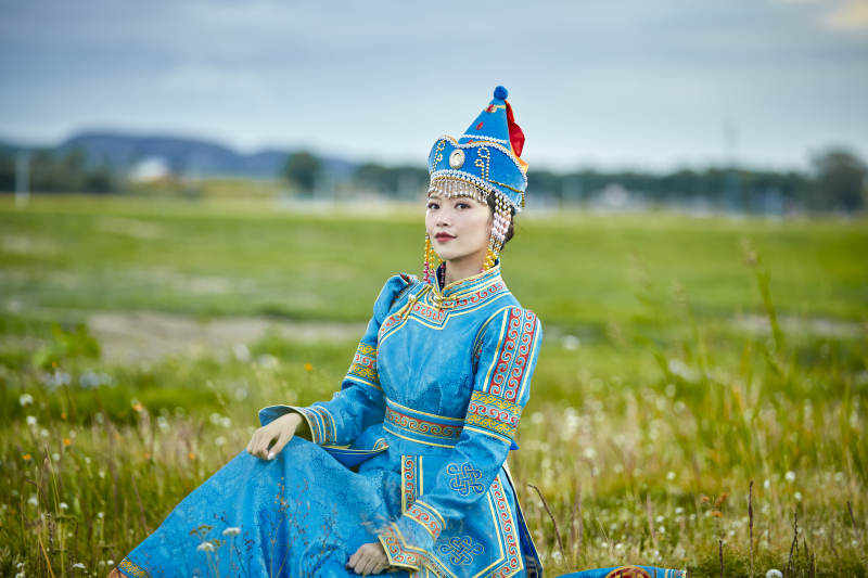 草原上身穿豪华蒙古族服饰的蒙族少女