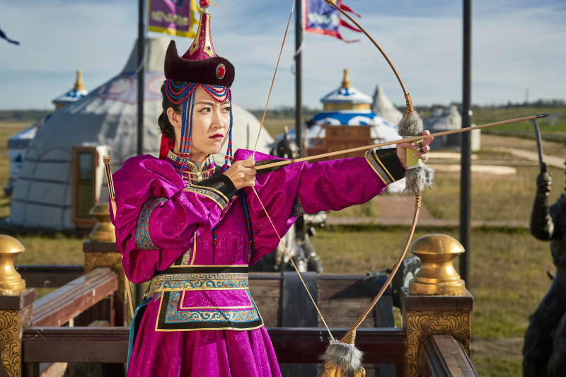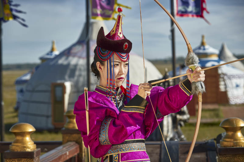 蒙古包前身穿蒙古族饰手持弓箭的蒙族少女