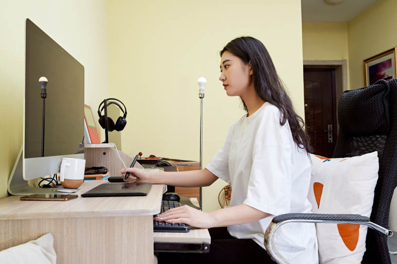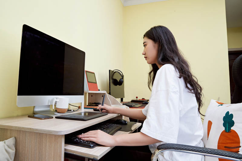 居家在电脑前创作插画的年轻美女