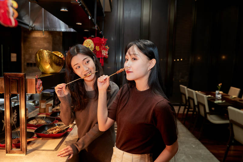 在酒店自助餐厅大吃特吃的亚洲可爱闺蜜少女