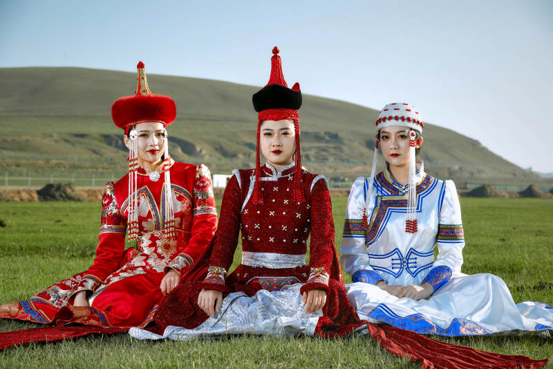 草原上穿着蒙古族传统服饰的亚洲年轻美少女