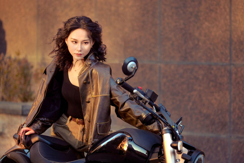 夕阳午后骑复古摩托进行拍照的东方美女