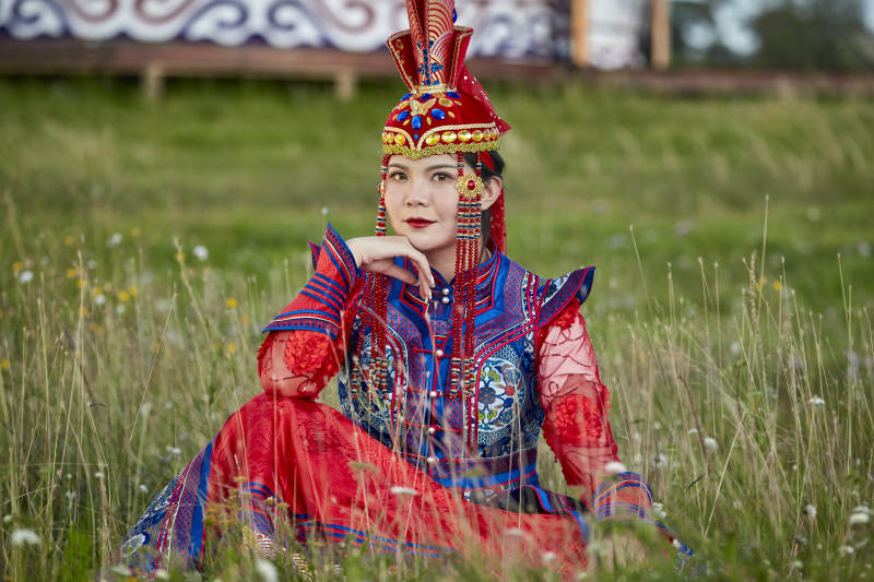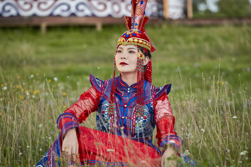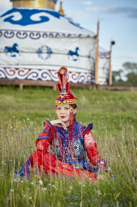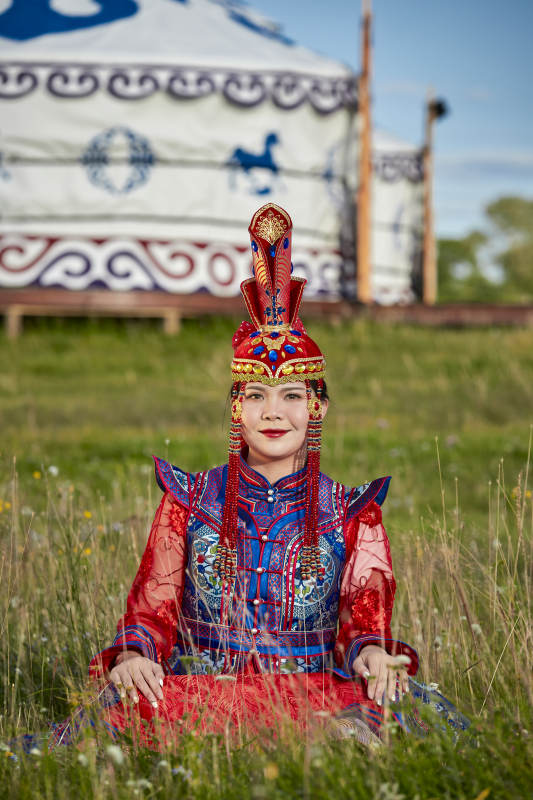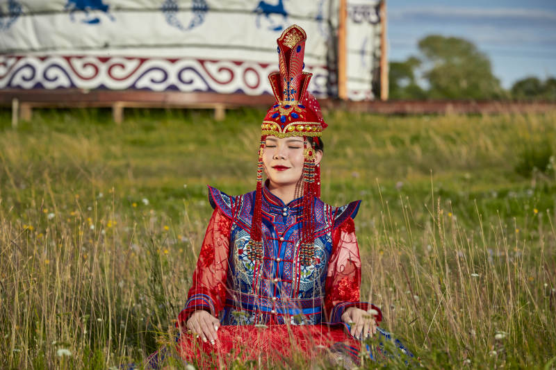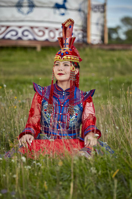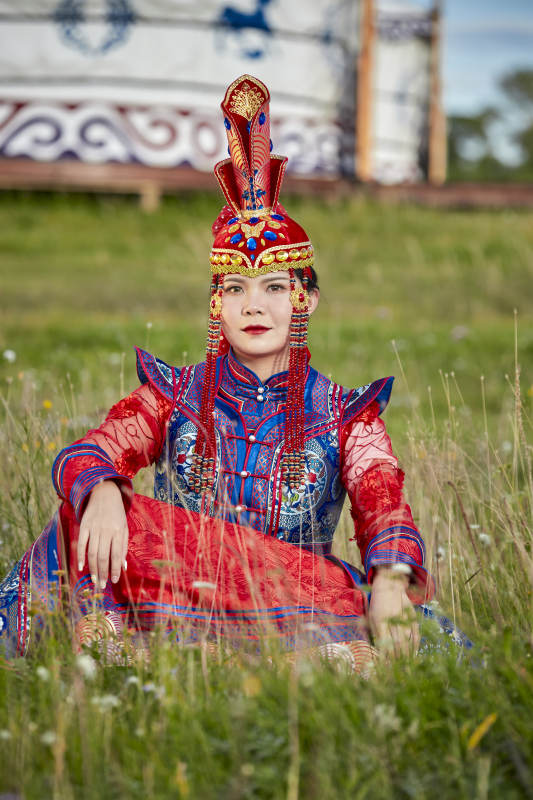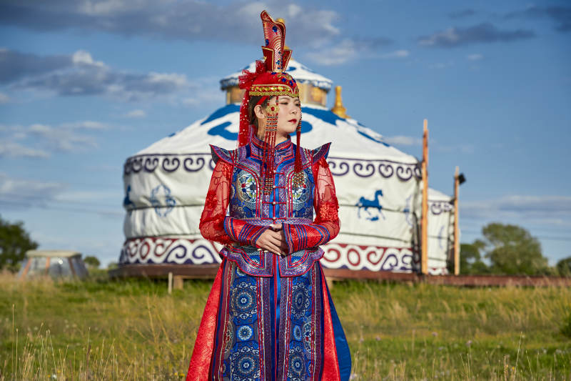 草原蒙古包前身穿豪华蒙古族服饰的蒙族少女