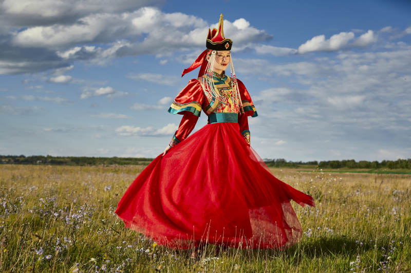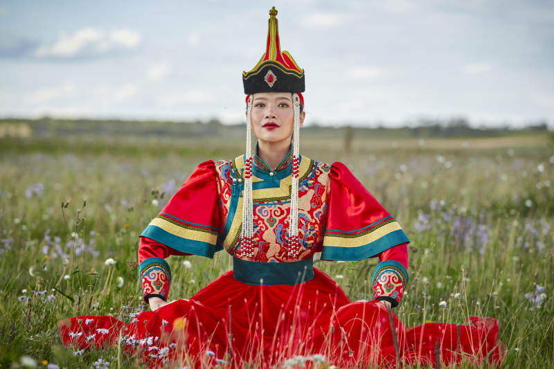 草原上身穿豪华蒙古族服饰的蒙族少女