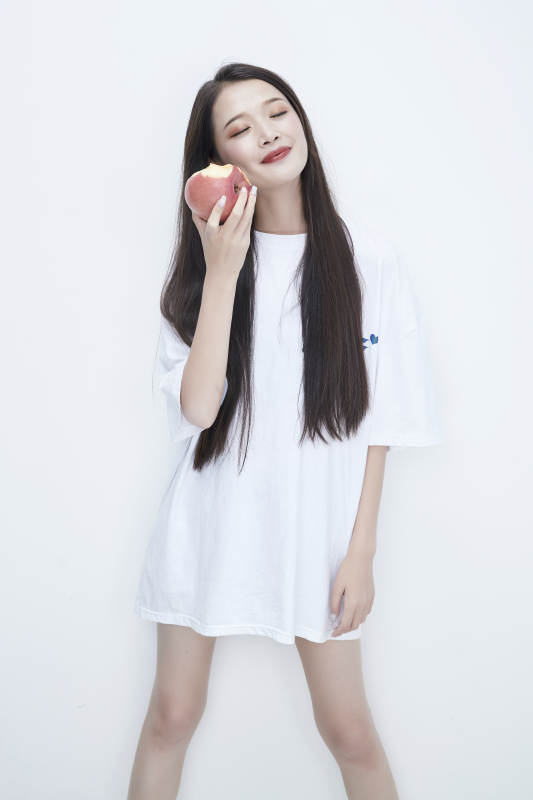 吃苹果的穿白色长T血衫的长发可爱少女人像