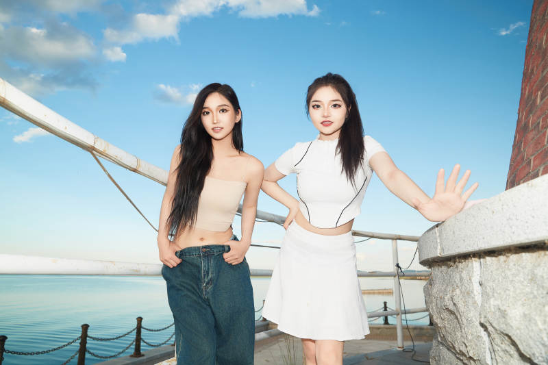 盛夏在景区湖边灯塔上拍照游玩的美女们