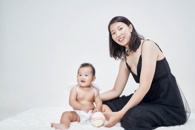 白色背景的美丽妈妈与可爱女儿亲子人像
