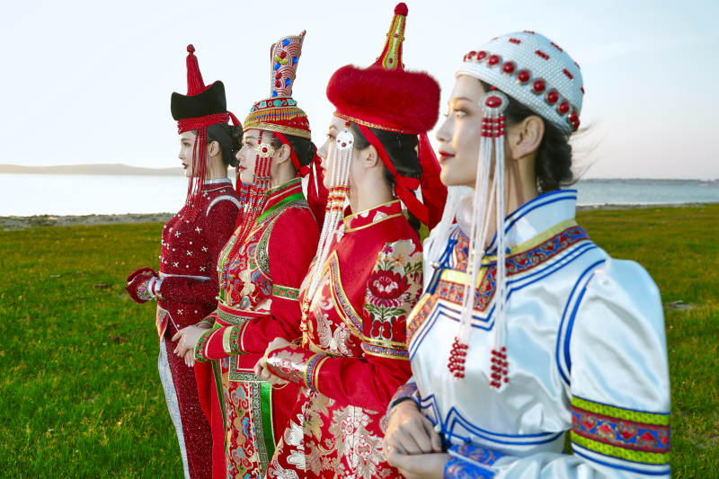 草原上穿着蒙古族传统服饰的亚洲年轻美少女