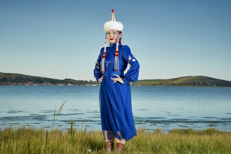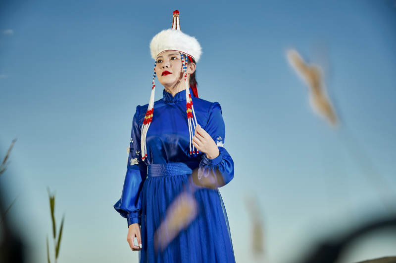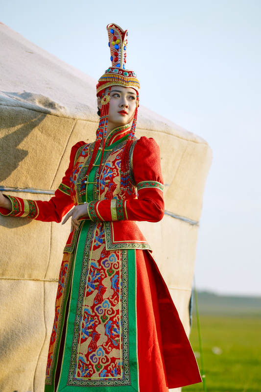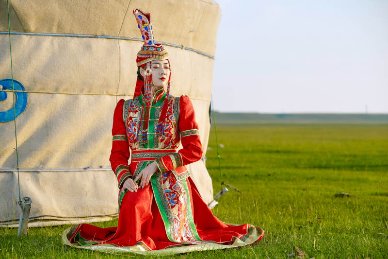 草原上穿着蒙古族传统服饰的亚洲年轻美少女