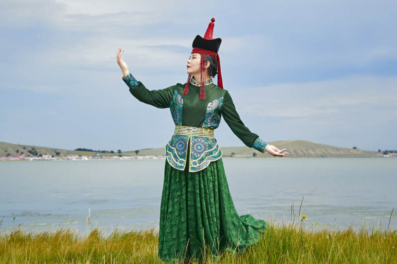 草原上身穿豪华蒙古族服饰的蒙族少女