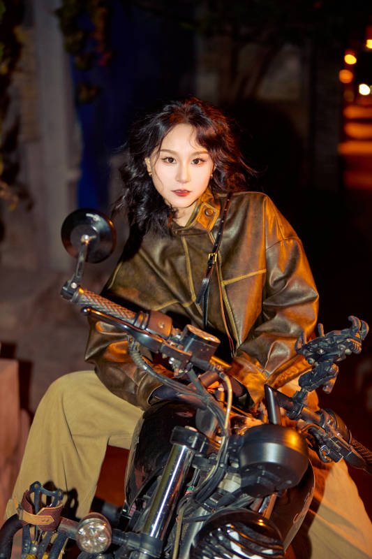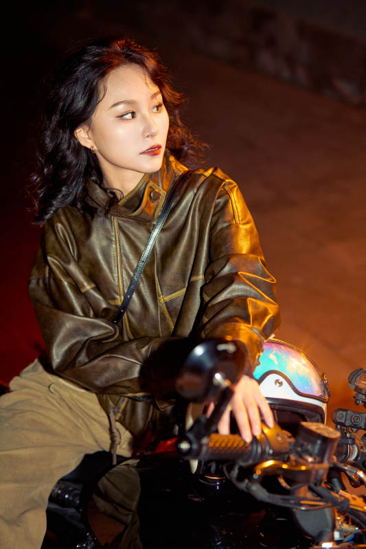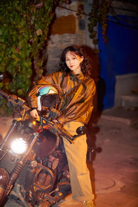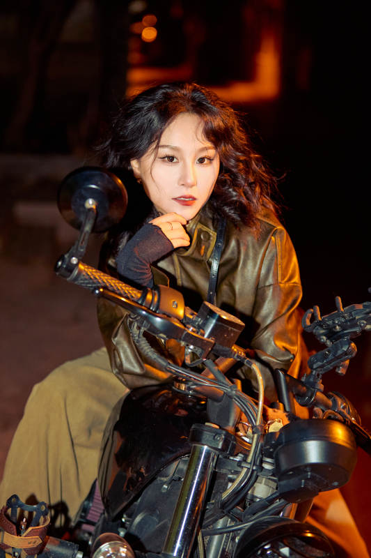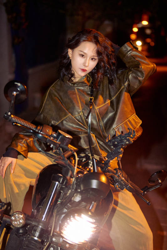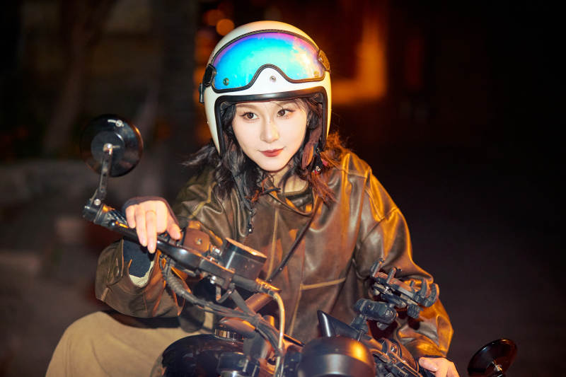 夜色下骑复古摩托车的亚洲美女