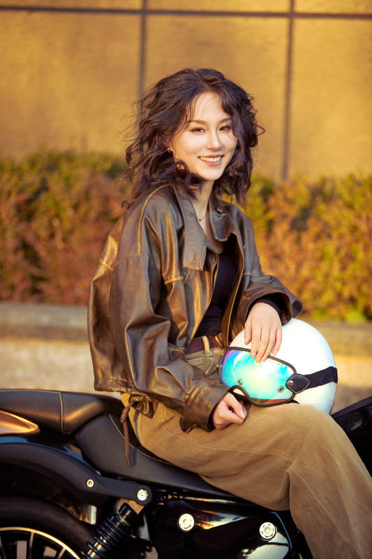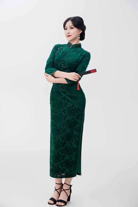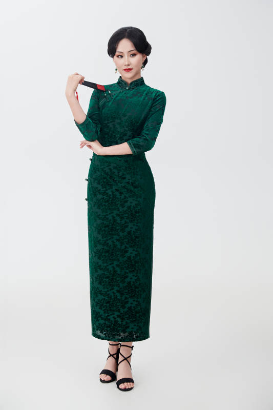 手拿纸扇身着中式旗袍坐在凳子上的美女