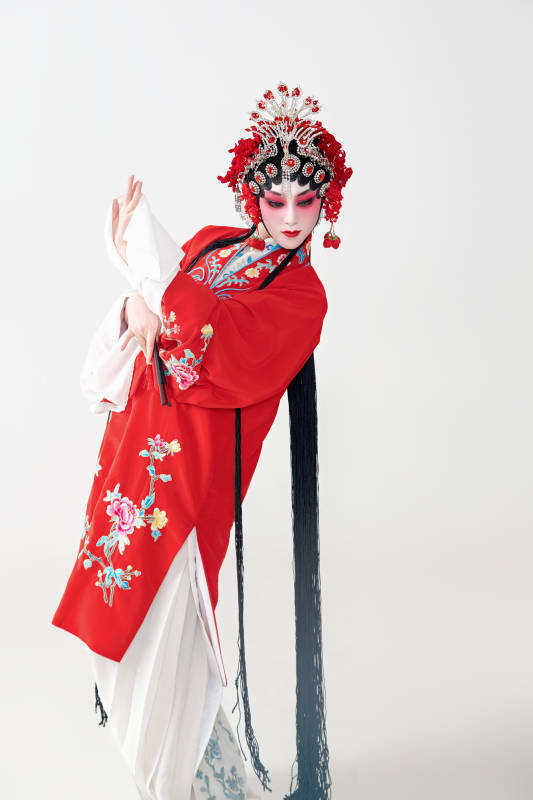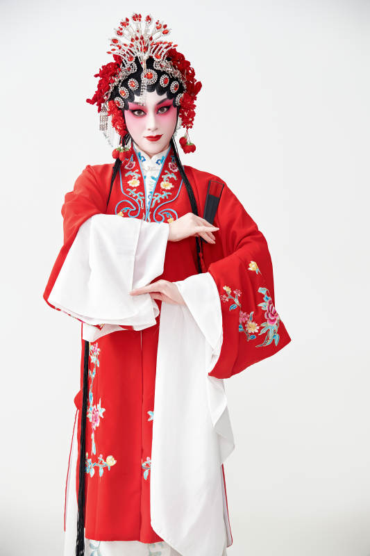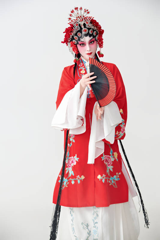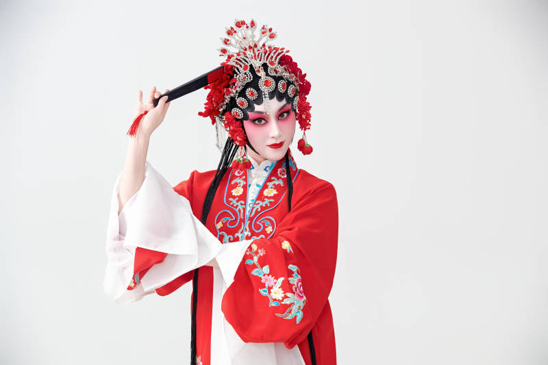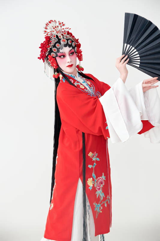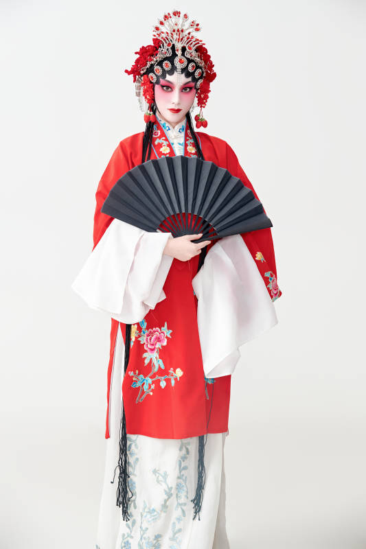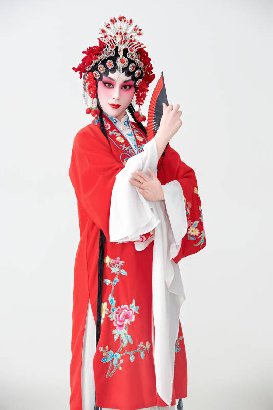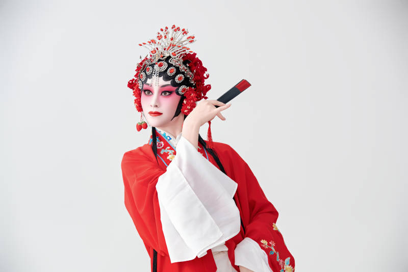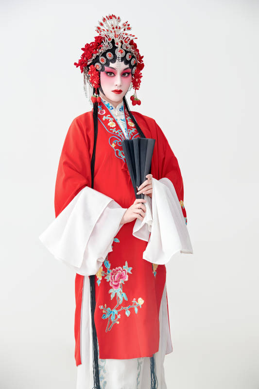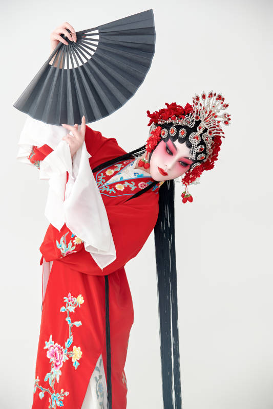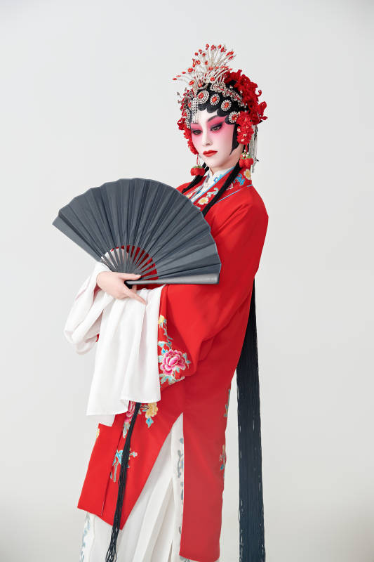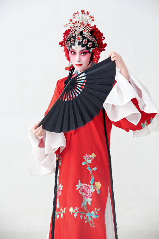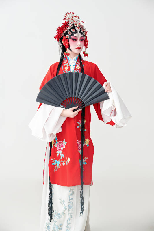 手拿纸扇身着中式旗袍坐在凳子上的美女