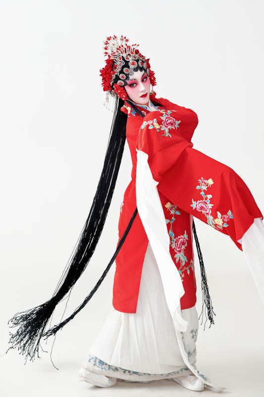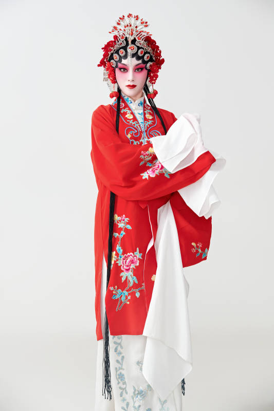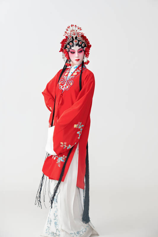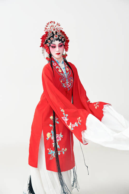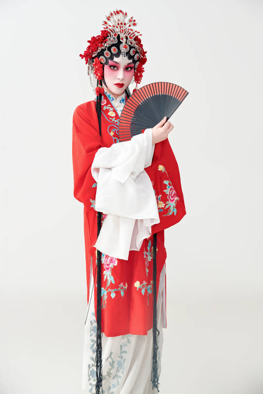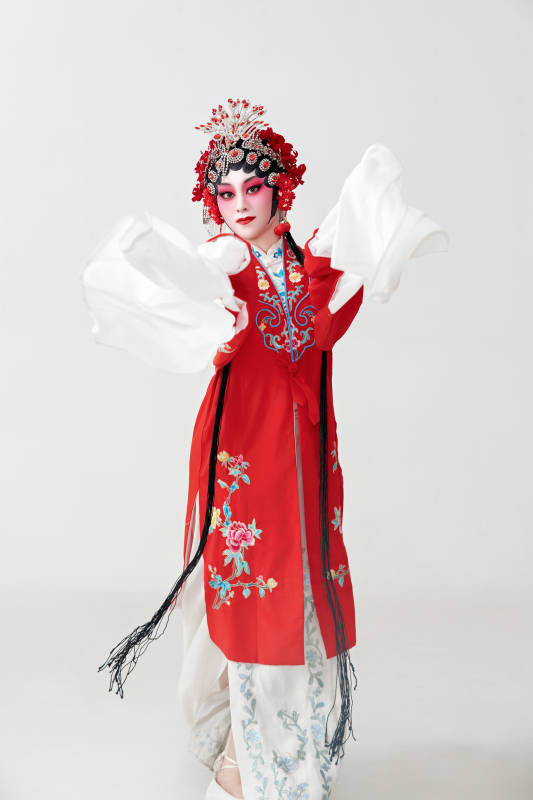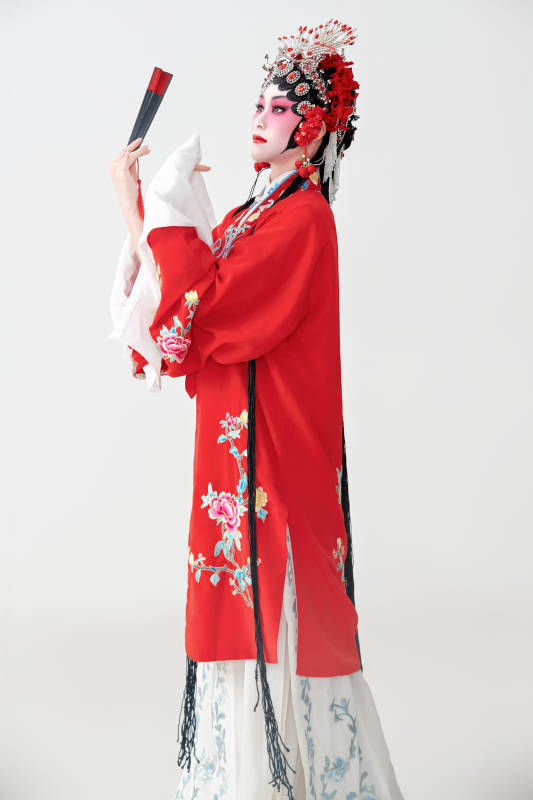 表演中国国粹京剧动作的红衣花旦女性演员