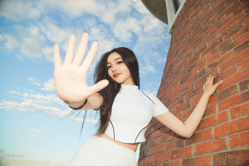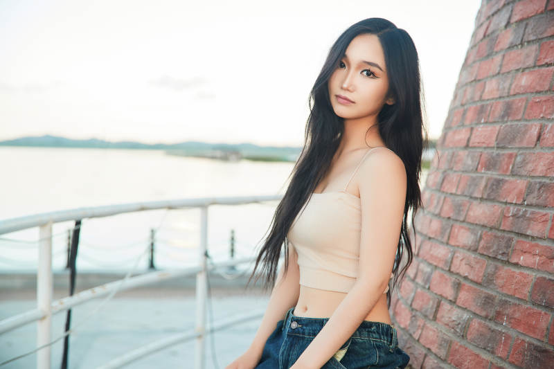 盛夏在景区湖边灯塔上拍照游玩的美女