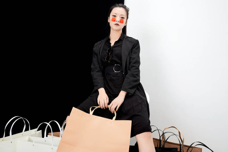 黑白色背景下的手提购物袋的时尚亚洲少女