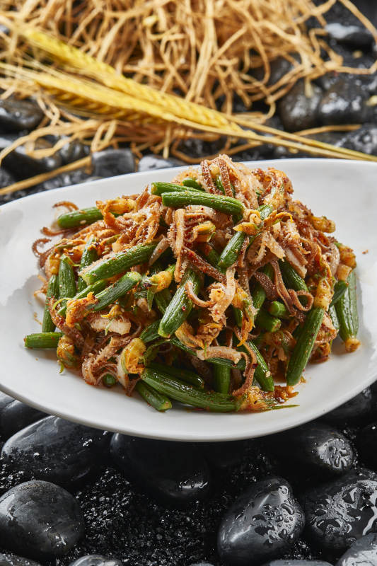 白色瓷盘装的鲜橙杏仁儿拌蕨菜