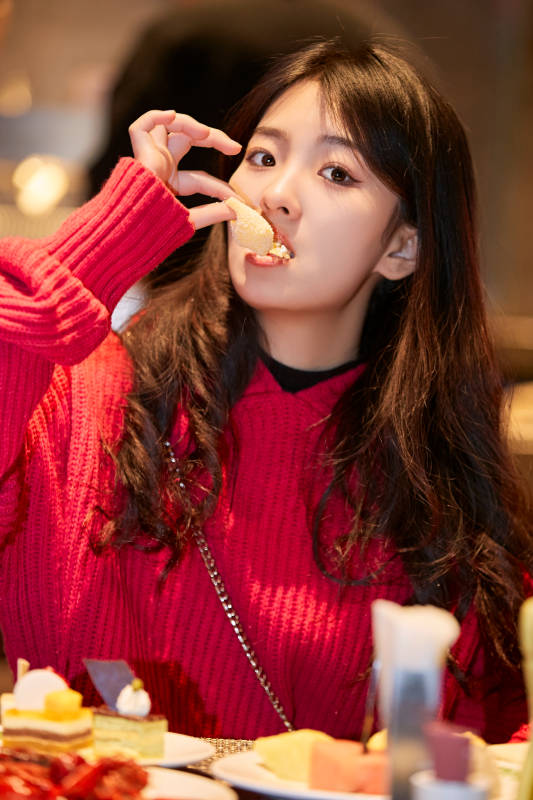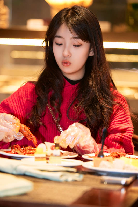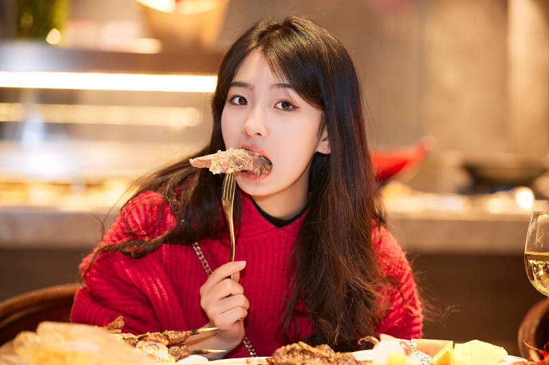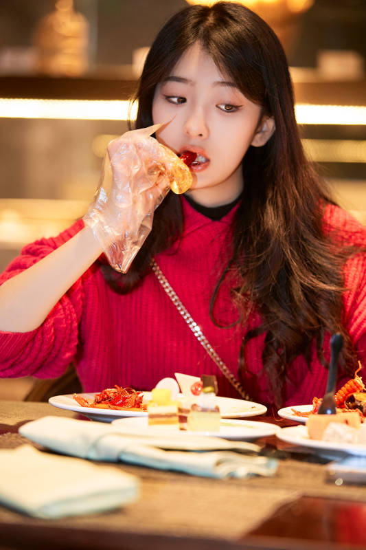 在酒店自助餐厅大吃特吃的可爱少女