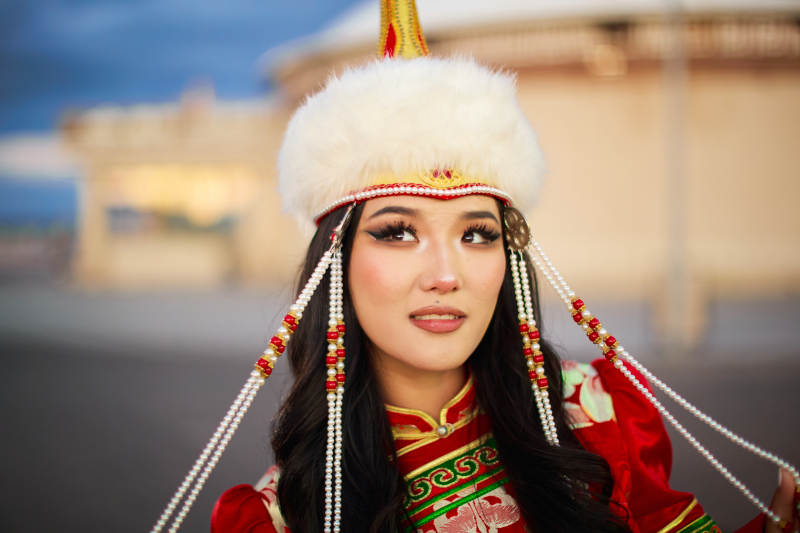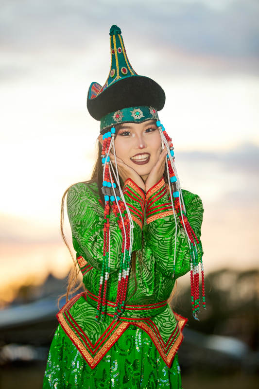 身穿蒙古族不里亚特部落传统服饰的蒙族姑娘
