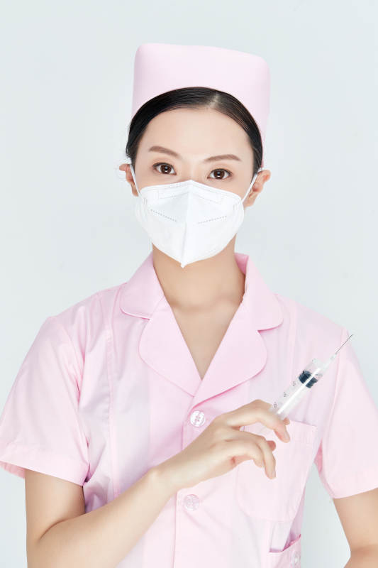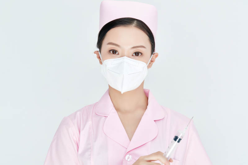 穿护士服戴口罩手执针筒的年轻女护士