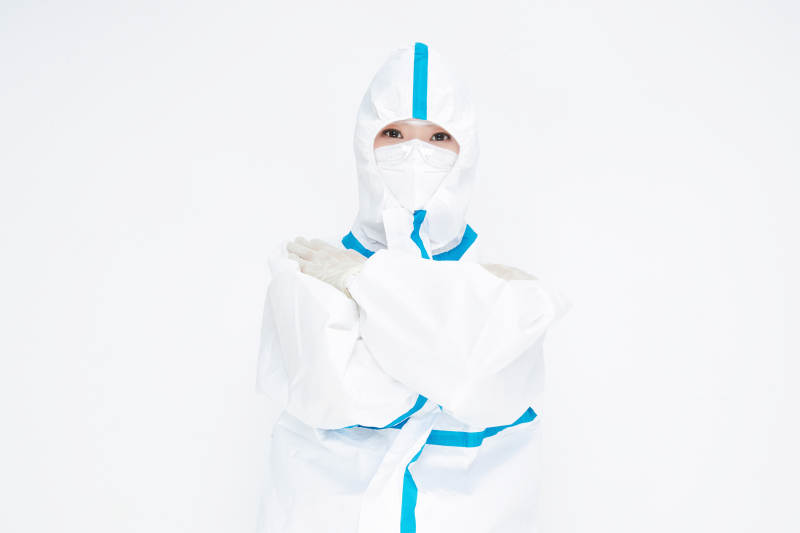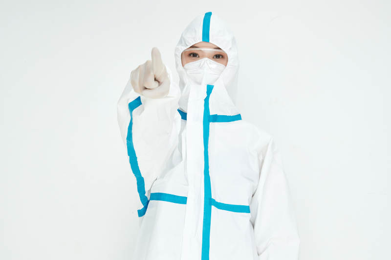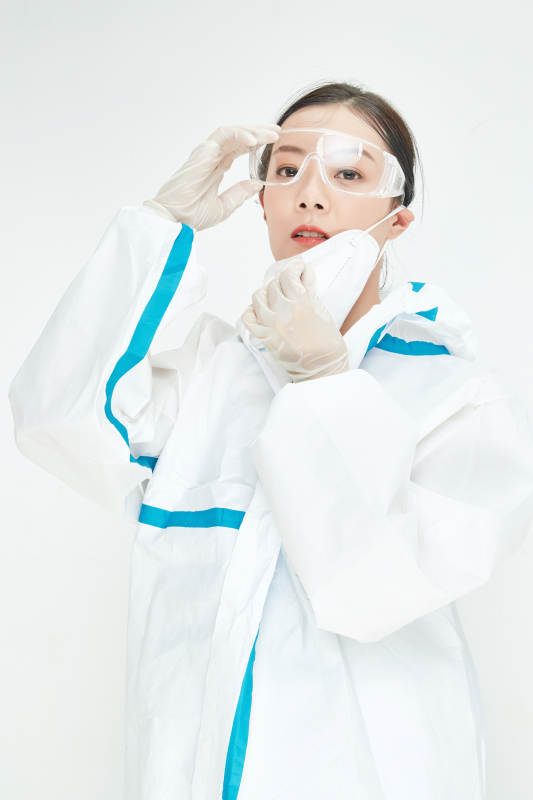 穿白色防护服佩戴护目镜口罩的女性医疗人员