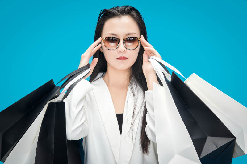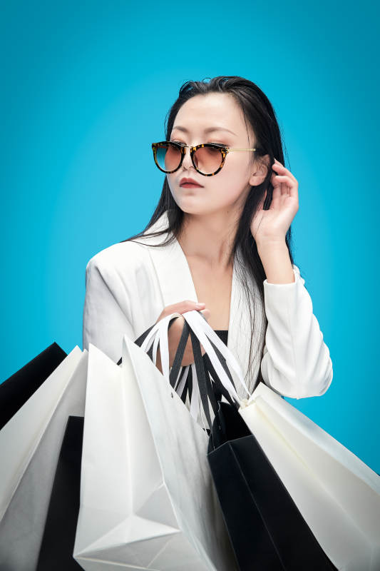 青蓝色背景下手提购物袋的亚洲时尚少女
