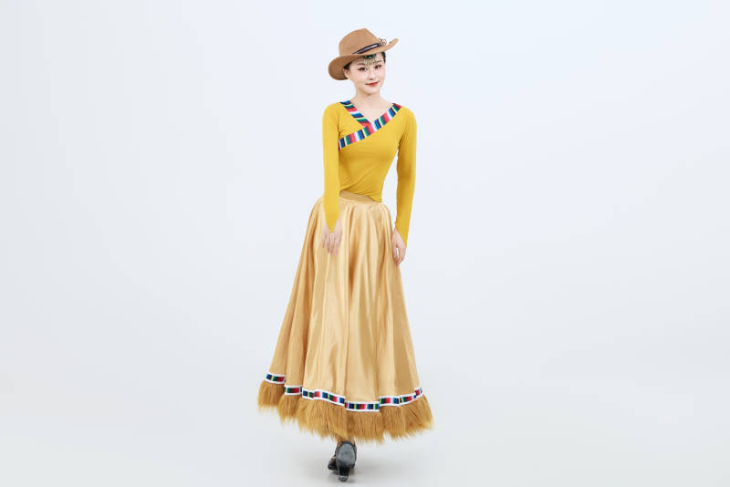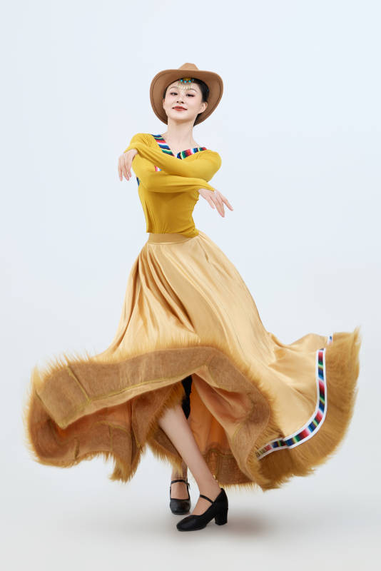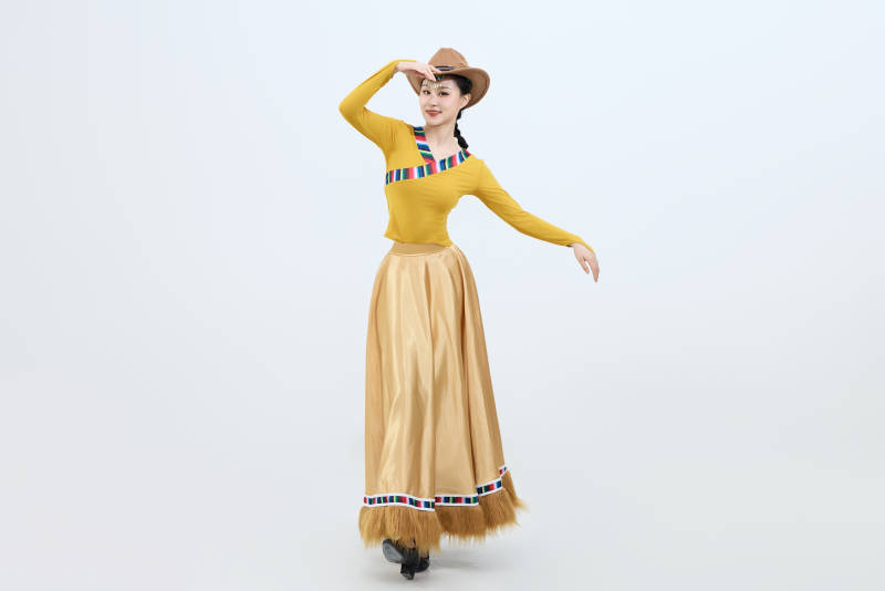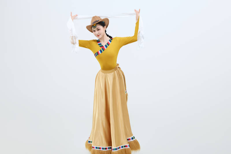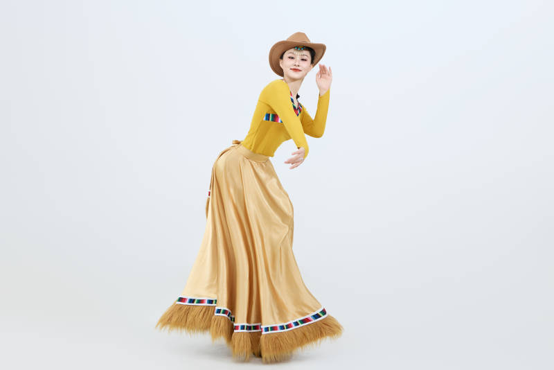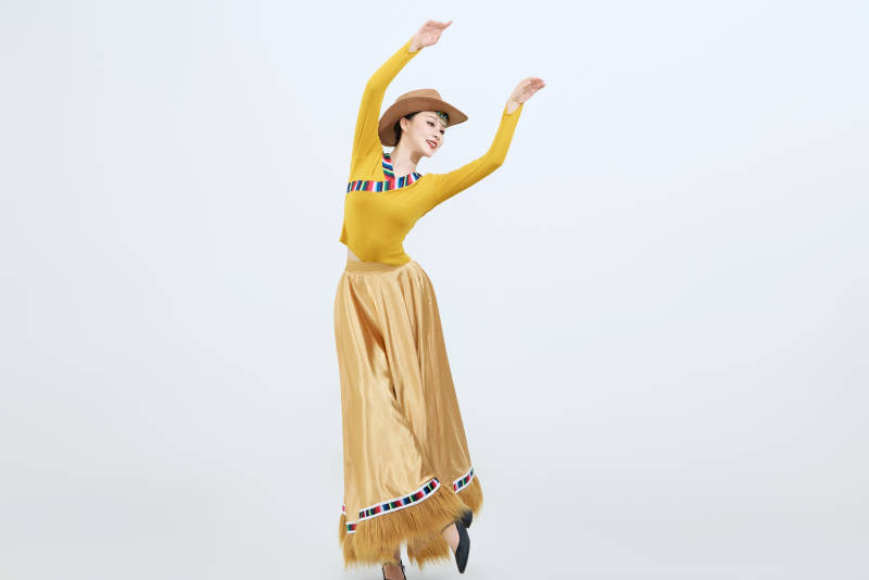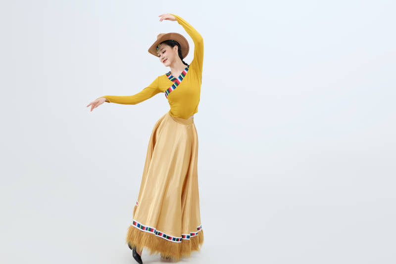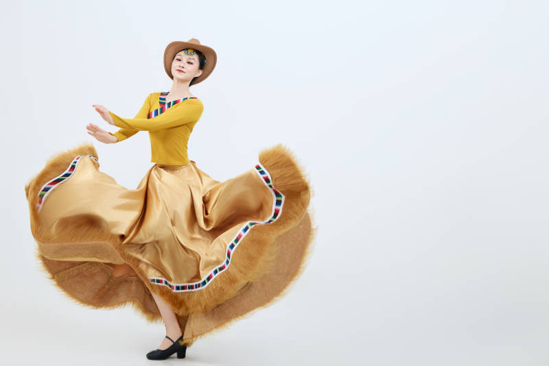 表演中国西藏藏族传统锅庄舞的美丽舞者