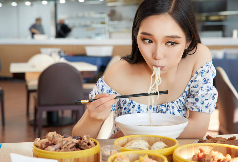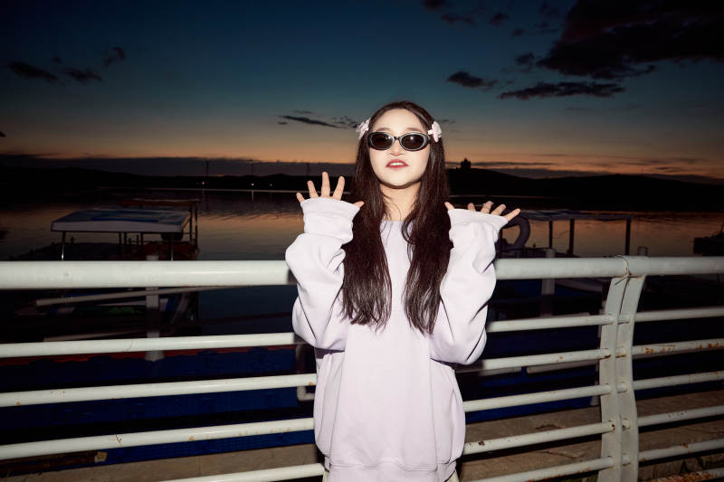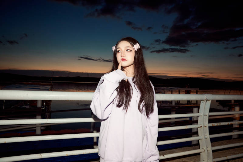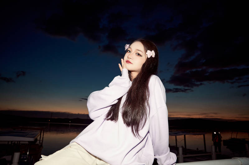 傍晚在湖边欣赏风景拍照的亚洲美女